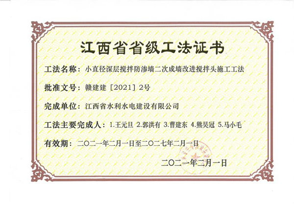 2021年2月1日,江西省住房和城鄉(xiāng)建設(shè)廳文件《關(guān)于公布我省2020年度第二批省級工程建設(shè)工法的通知》(贛建建〔2021〕2號)公布了2021年度第二批省級工程建設(shè)工法評審結(jié)果,其中,公司申報(bào)的《小直徑深層攪拌防滲墻二次成墻改進(jìn)攪拌頭施工工法》、《嵌巖混凝土防滲墻液壓抓斗純抓發(fā)造槽施工工法》審定為“2020年度省級工程建設(shè)工法”。