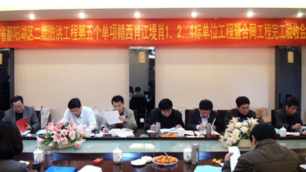 驗收會由江西省鄱陽湖區(qū)二期防洪工程第五個單項工程建設項目部副主任陶理志主持,建設項目部總工程師鄒軍賢、宜春市水利局劉啟明副局長、樟樹市水利局吳學輝、公司副總經(jīng)理胡鴻煌等出席了驗收會。