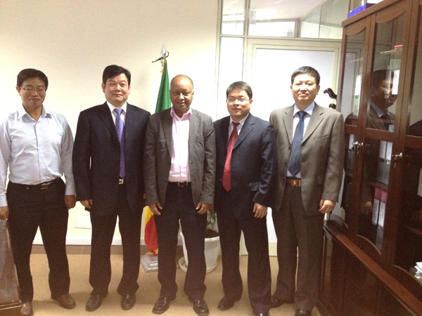 董事長(zhǎng)王元旦(左二)、副總經(jīng)理張周平(右一)、聶玉和(左一)、埃塞分公司經(jīng)理王毓平(右二)與埃塞政府前副總理(現(xiàn)任埃塞糖業(yè)公司總經(jīng)理)ABAY TSEHAY(左三)合影