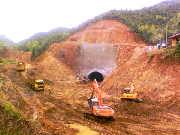 高倚四級(jí)水電站位于遂川江北支江高倚段,壩址座落在江西省遂川縣大坑鄉(xiāng),是贛江水系一級(jí)支流遂川江北支流梯級(jí)開發(fā)電站群中的一座。該水電站是一座以水力發(fā)電為主的低壩引水式小型水電站工程,安裝3臺(tái)軸流定槳立式水輪發(fā)電機(jī)組,總裝機(jī)容量7500千瓦,多年平均發(fā)電量2466萬千瓦時(shí)。水庫正常蓄水位134.5米,總庫容224.3萬立方米,主要由擋水壩建筑物、引水建筑物、廠房建筑物、防護(hù)工程及并網(wǎng)輸電線路五部分組成,為?。á瘢┬退娬竟こ?,工程等別為Ⅳ等。大壩壩軸線總長(zhǎng)269米,引水隧洞總長(zhǎng)1414.9米,隧洞為無壓城門形斷面,開挖斷面達(dá)60平方米(屬超大型斷面),引水隧洞進(jìn)口支洞長(zhǎng)度42米。