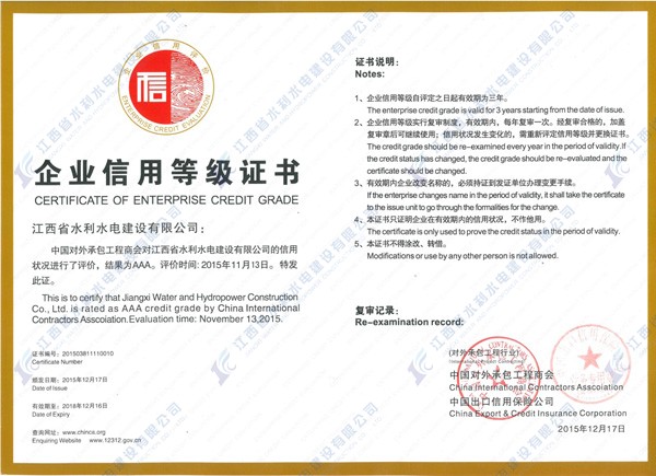 根據(jù)商務(wù)部、國資委聯(lián)合發(fā)布的《商會協(xié)會行業(yè)信用建設(shè)工作指導(dǎo)意見》和《關(guān)于進一步做好行業(yè)信用評價工作的意見》的要求,結(jié)合承包商會關(guān)于推進行業(yè)信用體系建設(shè)的工作部署,承包商會于2015年7月啟動2015年度對外承包工程企業(yè)與勞務(wù)合作企業(yè)信用等級評價工作,經(jīng)對外承包工程企業(yè)與勞務(wù)合作企業(yè)信用等級評審委員會第十一次工作會議審議,江西省水利水電建設(shè)有限公司被評定為2015年度對外承包工程企業(yè)信用評價AAA級信用企業(yè)。