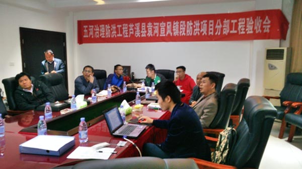 集團(tuán)資訊 2016年10月31日,我公司承建的五河治理防洪工程蘆溪縣袁河宣風(fēng)鎮(zhèn)段防洪項(xiàng)目在蘆溪縣水務(wù)局會(huì)議室主持召開(kāi)了分部工程驗(yàn)收會(huì)議,分部工程驗(yàn)收工作組由江西省五河治理防洪工程項(xiàng)目部、蘆溪縣五河治理防洪工程項(xiàng)目部、江西省水利規(guī)劃設(shè)計(jì)院、江西省建洪工程監(jiān)理咨詢有限公司以及我公司等相關(guān)單位的代表組成。公司工程部郭洪有出席了此次驗(yàn)收會(huì)議。