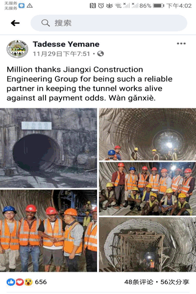 參觀(guān)結(jié)束時(shí),Tadesse先生由衷感謝大家的辛勤付出,對(duì)項(xiàng)目部順利完成隧洞首倉(cāng)襯砌砼表示高度贊許,并相信項(xiàng)目部一定能保質(zhì)保量完成隧洞二期襯砌施工。Tadesse先生還在Facebook(臉書(shū))平臺(tái)分享了本次隧洞參觀(guān)的經(jīng)歷,并表達(dá)了對(duì)我公司作為戰(zhàn)略合作伙伴的充分信任。