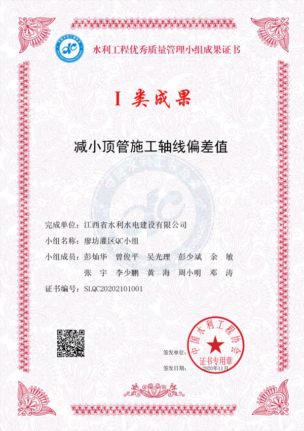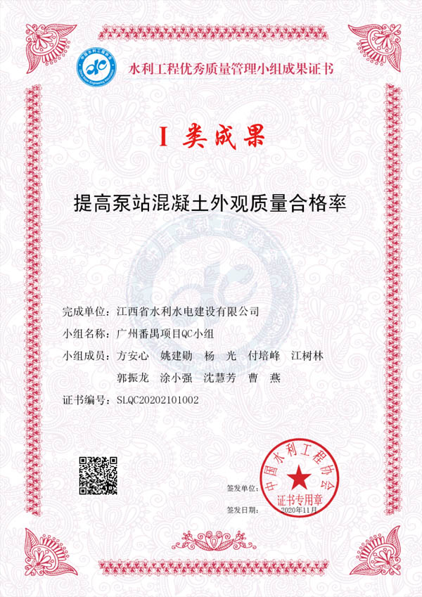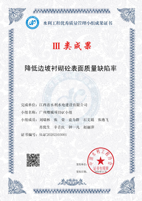 其中:廖坊灌區(qū)QC小組編寫的《減小頂管施工軸線偏差值》獲I類成果獎(jiǎng)、廣州番禺項(xiàng)目QC小組編寫的《提高泵站混凝土外觀質(zhì)量合格率》獲I類成果獎(jiǎng)、廣州增城項(xiàng)目QC小組編寫的《降低邊坡襯砌砼表面質(zhì)量缺陷率》獲III類成果獎(jiǎng)。