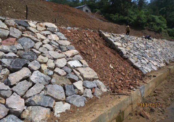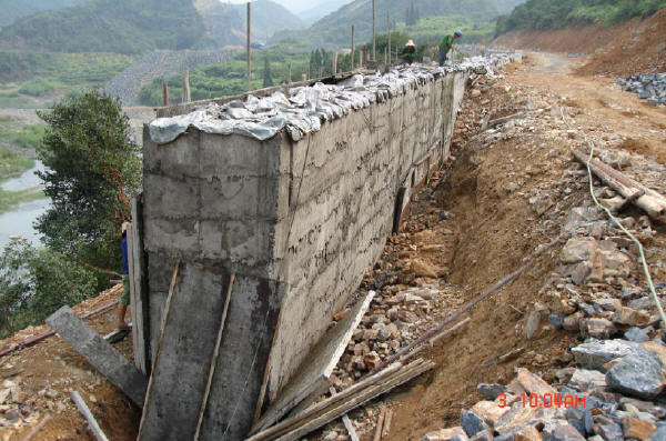 擋墻砌筑應分層,每一砌筑層擺石時均應座漿,隨鋪漿隨砌筑。嚴禁石塊大面無漿直接貼靠?;炷帘仨氂谜駬v器逐縫振搗。當豎縫寬度在5cm以上時,可填漿后塞片石。嚴禁先堆砌石塊再用膠結料灌縫。
