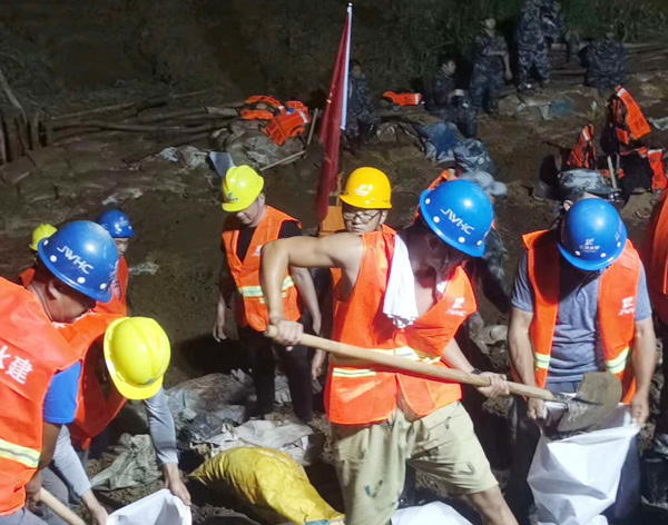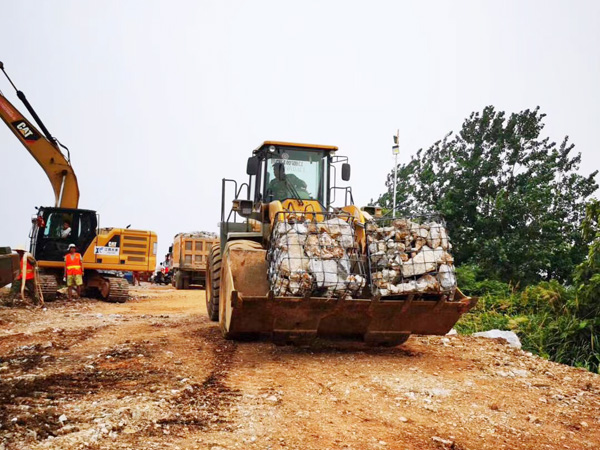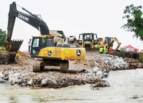 7月14日14時,封堵作業(yè)正式啟動,南北兩岸同時進(jìn)占施工。然而,困難層出不窮:道路不平,存在積水,影響車輛通行;一線搶險人員的生活保障還不夠完善,吃住條件艱苦,防雨防曬防蚊設(shè)施簡陋,無便攜照明設(shè)施;砂石骨料耗量巨大,但存在配額限制,獲取來源較少。但現(xiàn)場人員攻堅克難,積極與政府、當(dāng)?shù)丶捌h(yuǎn)廠商溝通,解決了人員基本需求和石料問題,并在當(dāng)日順利鋪石20米,邁上堅實的第一步。